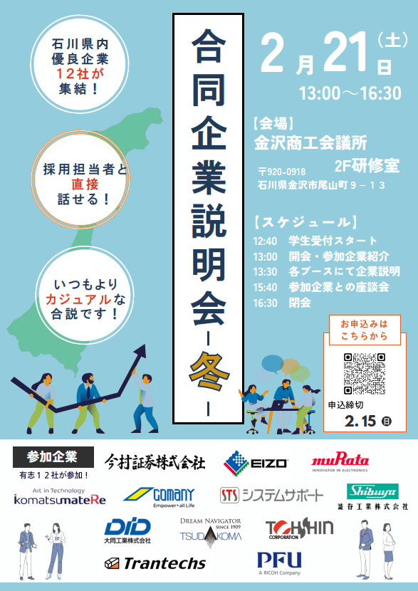 このたび、石川県内の優良企業12社が集結する「合同企業説明会 -冬-」を開催いたします。 ぜひご参加、ご予約をお待ちしております!