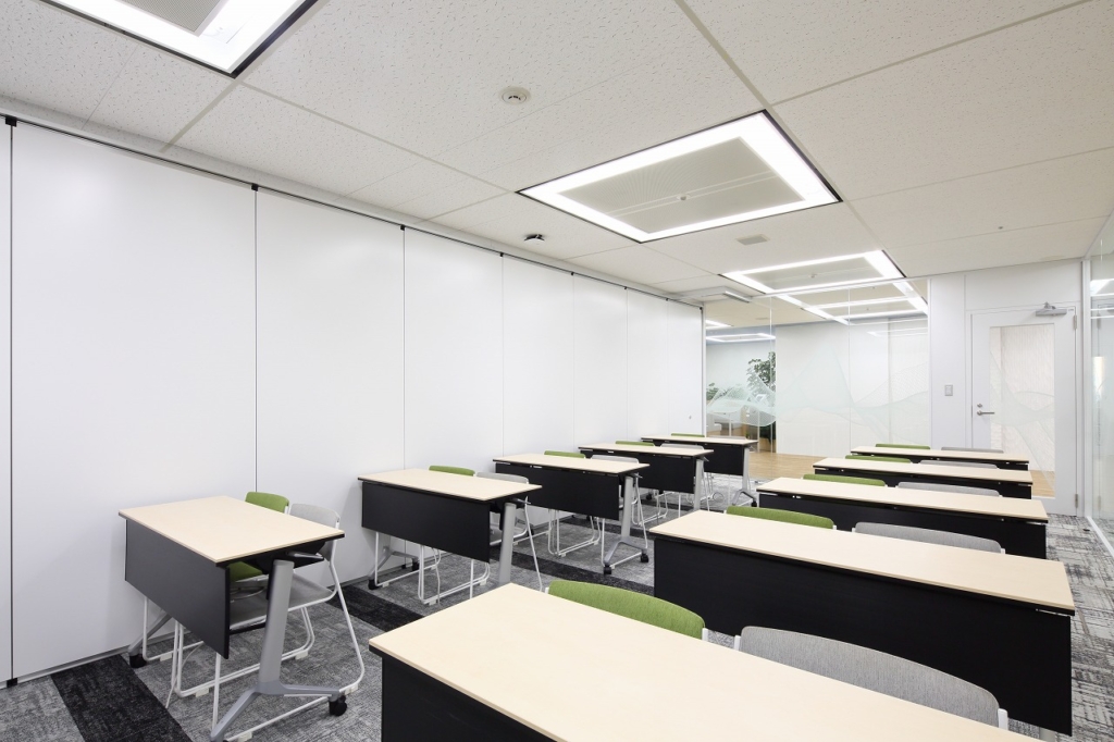 こちらの研修室では移動間仕切りで仕切られる箇所でも、ホワイトボードを分割せず一枚で設置することにより、文字や図面が途切れないような工夫など、細部までこだわった空間を用意しています。