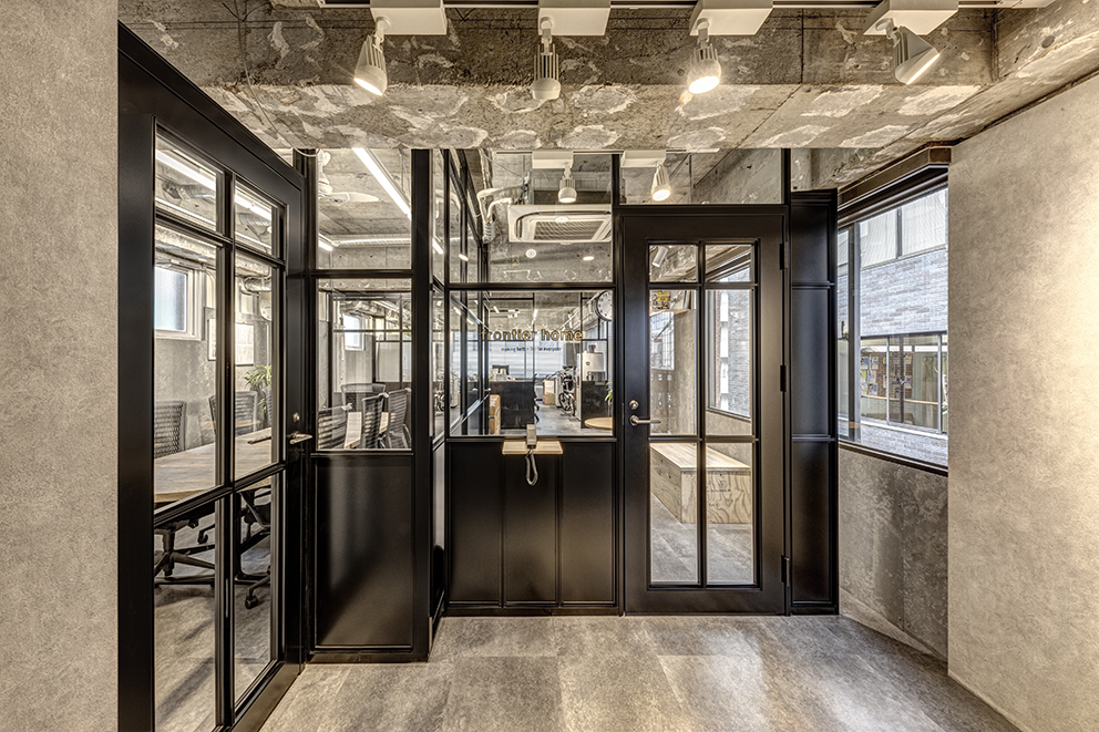 天井と壁は打ちっ放しの軽鉄むき出しの意匠を活かして、ブラックフレームの間仕切で引き締めるシャープな仕上がり。空間全体が馴染む、心地よい落ち着いた雰囲気にインテリアも統一しました。
