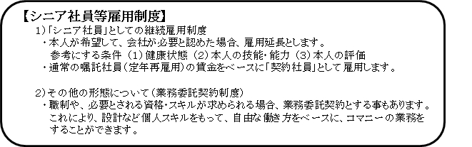 コマニーでは、これまで培った知見や経験を活かして働いて頂くこと、また後進の育成など、一人ひとりに合った65歳以降の新たな働き方の実現に向けて、健康で意欲のある高齢者が元気に活躍し続けることができる職場、環境づくりを推進するとともに、全従業員がその能力を最大限に発揮し、いきいきと誇りをもって働き続けることができる企業を目指してまいります。