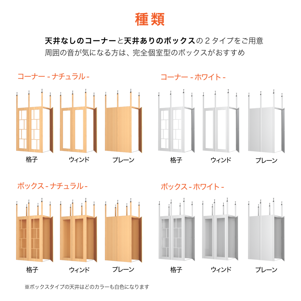 パネル部分はデザイン性の高い格子パネル、光を多く取り入れるウィンドパネル、採光部分のないプレーンパネルの3種類があります。また、囲い方として既存の壁を利用した天井なしのコーナータイプ、既存の壁を利用しない天井ありの完全個室のボックスタイプがあります。