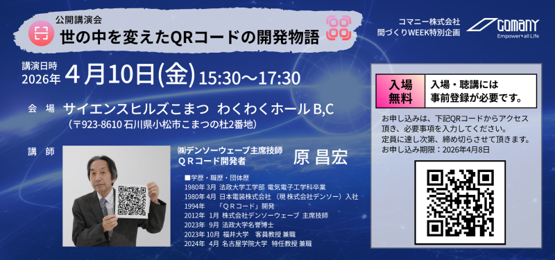 間仕切りで新たな価値を創造する間づくりカンパニーのコマニー株式会社(本社:石川県小松市、代表取締役社長執行役員:塚本健太)は、2026年4月10日にQRコードの開発者である、株式会社デンソーウェーブ主席技師、原 昌宏氏をお招きし、講演会の開催することをお知らせします。