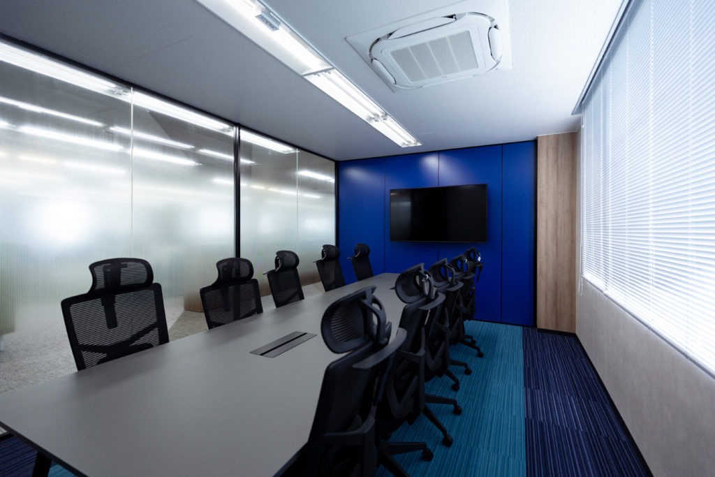 エントランスの内装は重厚感のあるゲートと、ガラスや木ルーバーの抜け感を掛け合わせて、落ち着いた高級感のあるおもてなしの場としてデザインしました。執務エリアは、拠点となる個室やフレームごとにカラーを切り替え、社員同士の交流がしやすいカジュアルでワクワクするような空間を目指しました。