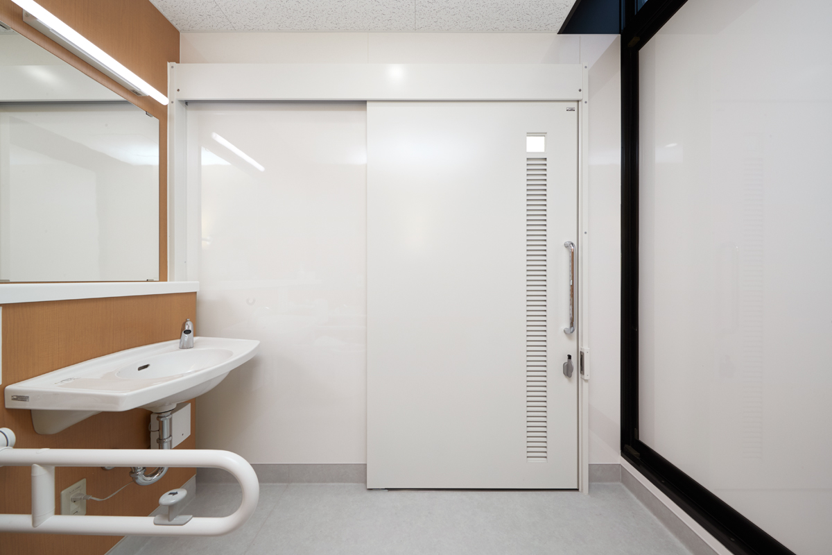 病院や福祉施設では、老人、子供、更に車イス、歩行器を必要とする人などハンディキャップを持った人々が多く、そこで使用される設備には、安全性に対する充分な配慮が必要になってきます。ハンギング・ドアは引き戸ですからドアの開閉で人の動きを妨げることはありません。