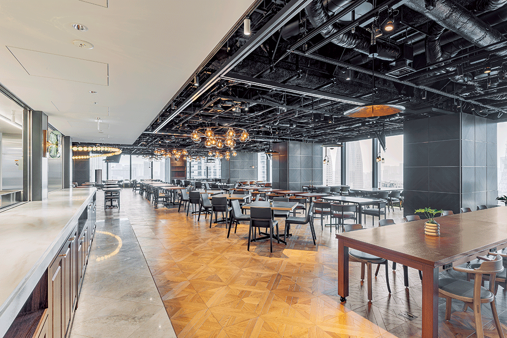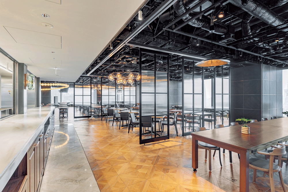 ユーザー様の理想に近いご提案を実現するため、何度もデザイナー様の元に通い、どのような空間を実現したいのかを徹底的にヒアリングしました。この空間を使用する、日本ビジネスシステムズ株式会社様 は「人と人の繋がりを大切にされる会社」であるこ とが分かり、従業員同士だけでなく、お客様と打ち合わせ後に一緒に食事を取り、和やかな雰囲気の中で語り合い関係性を深めることができる空間を要望されていました。 ヒアリングの中で、まだお客様が気付かれていない潜在的な要望があるのではないかと想像し、レイアウトの自由度が高い仕様をご提案したところ、とても良い反応をいただくことができました。