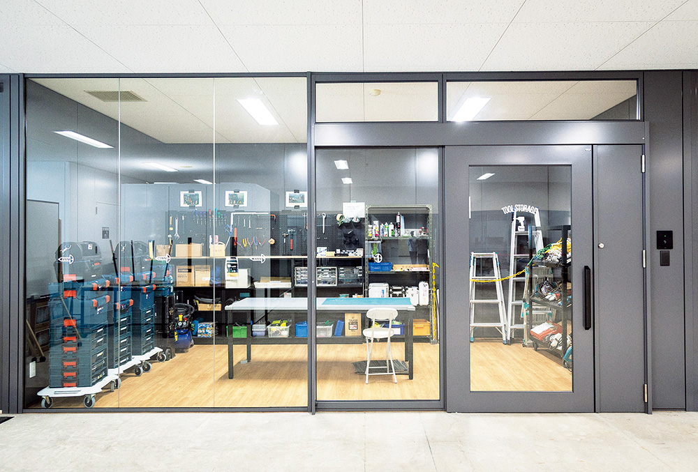 以前の開発エリアでは、試作施工用の工具が散らかりがちでした。これまでも片付けの呼びかけや管理方法のルール決めなどを試しましたが、なかなか定着しませんでした。どうすれば一糸乱れぬ工具室をつくることができるだろうか?と考え実施したのは、散らかっているのを隠すのではなく、「部屋をガラス張りにする」 という間づくりでした。自然と“魅せる”意識が生まれ、きれいな状態を保つことができています。