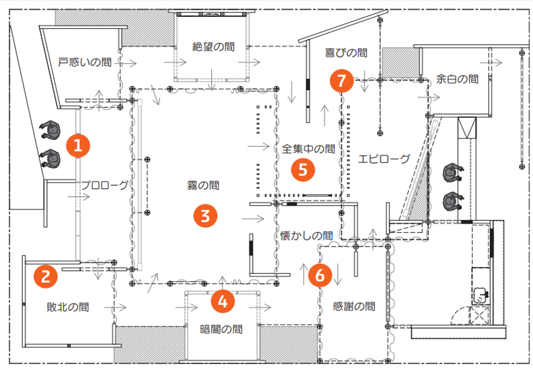 今回のブース体験は「選択による自分らしい働き方のデザイン」です。ブース全体を小説に見立 て、来場者が物語を読み進めるような体験を提 供しました。まるで人生の選択のように、様々な 選択肢の中から自分だけの道を選び、物語を紡 いでいく。そんな没入感のある空間演出を目指 しました。各エリアは物語の展開に合わせて「敗北の間」「暗闇の間」「霧の間」「全集中の間」と いった名称がつけられ、それぞれの空間で物語 に没入できるよう工夫が凝らされています。例え ば、「敗北の間」では、街中の雑踏を表現するために足元があけられており、嫌なことから逃げ出したくなる気持ちを表現しています。来場者には シートが渡され、物語を進めるたびに選択した番号の穴をあけていき、最後に自分がどのような物 語を紡いだのかが分かるしかけになっています。